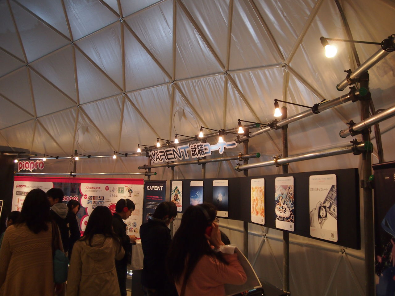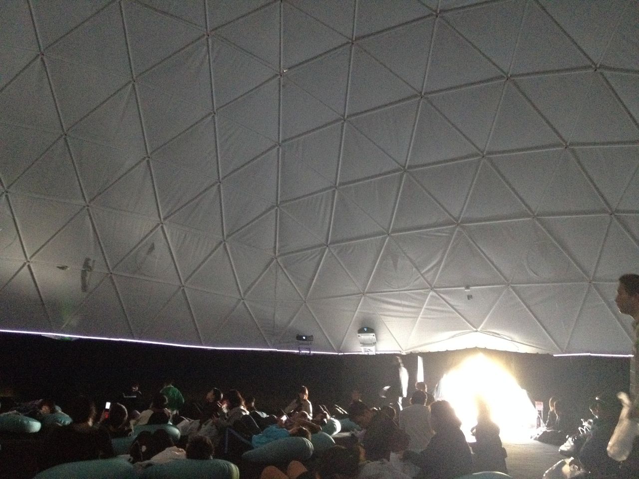 スカイライトシアターはプラネタリウムみたいに全天周映画装置でミクのPVを流すといった感じのイベント。入場は無料で、床にはカーペットとクッションが置かれ寝転んで仮設ドーム天井に写った画像とミクの歌を楽しむといった形です。