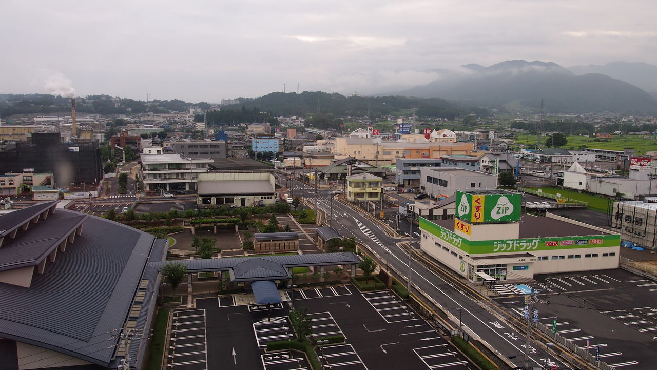 ホテルルートイン恵那の部屋から見る恵那の街並み。遠くに見える大きな工場は王子マテリア恵那工場。手前は恵那市中央図書館。空は曇ってはいるけど雨は振ってない模様。