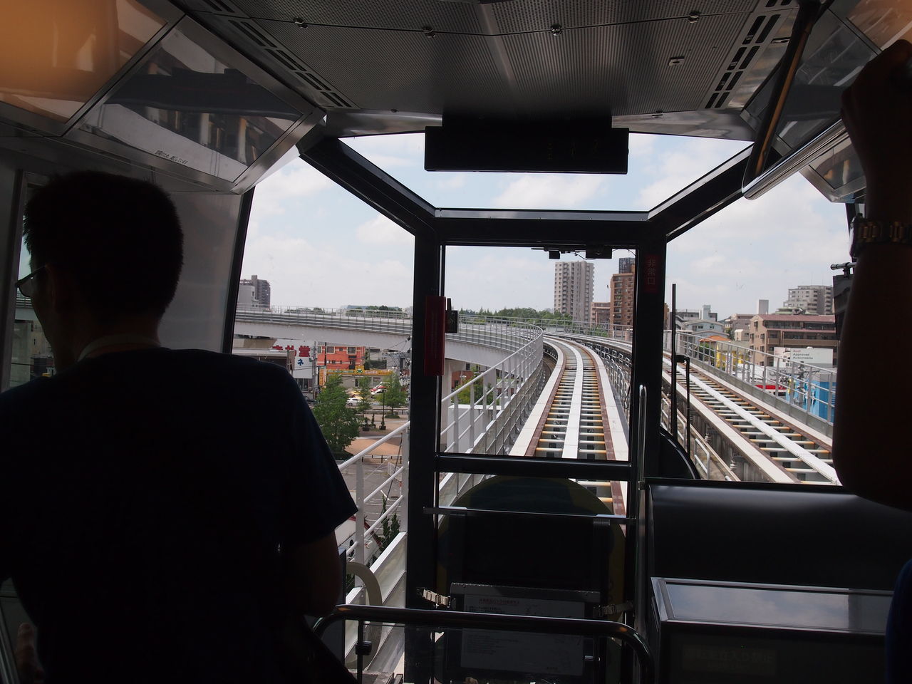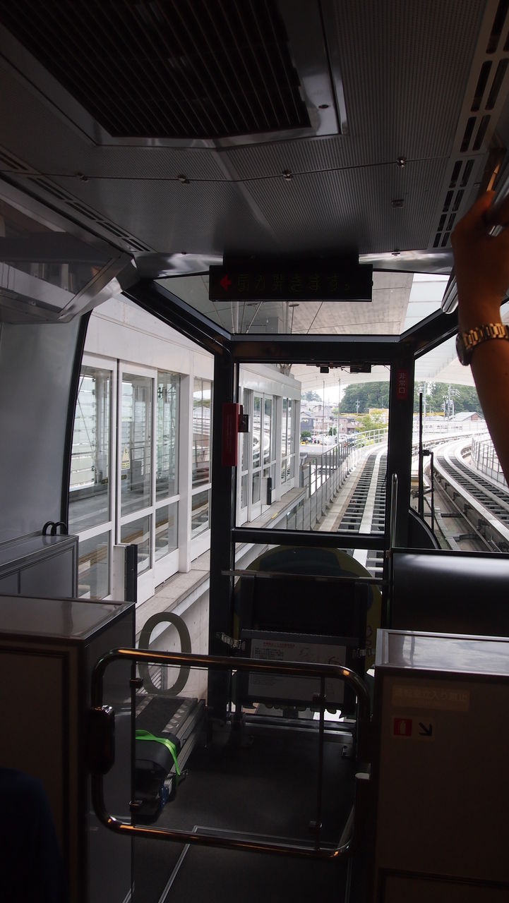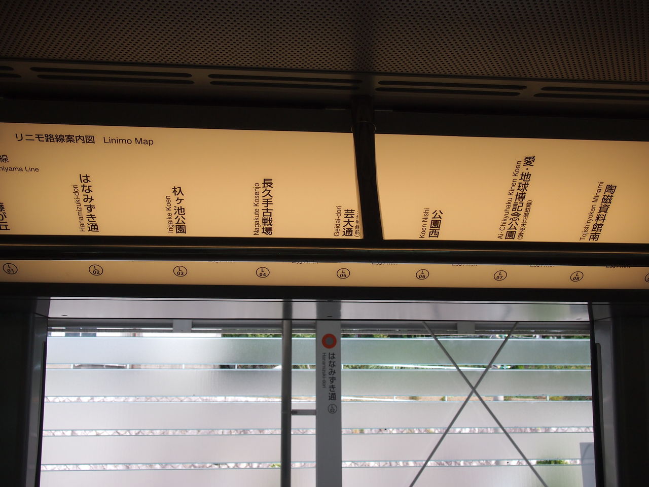 リニモ車内。リニモは自動運転なので運転士はいません。大阪のニュートラムみたいですね。でもニュートラムより未来的でカッコイイデザインです。あ、リニモはその名前からわかるようにリニアモーターカー(磁気浮上式鉄道)なのですよ?日本初の常設実用路線です。この車両に乗るだけでも来た甲斐があったと思います。