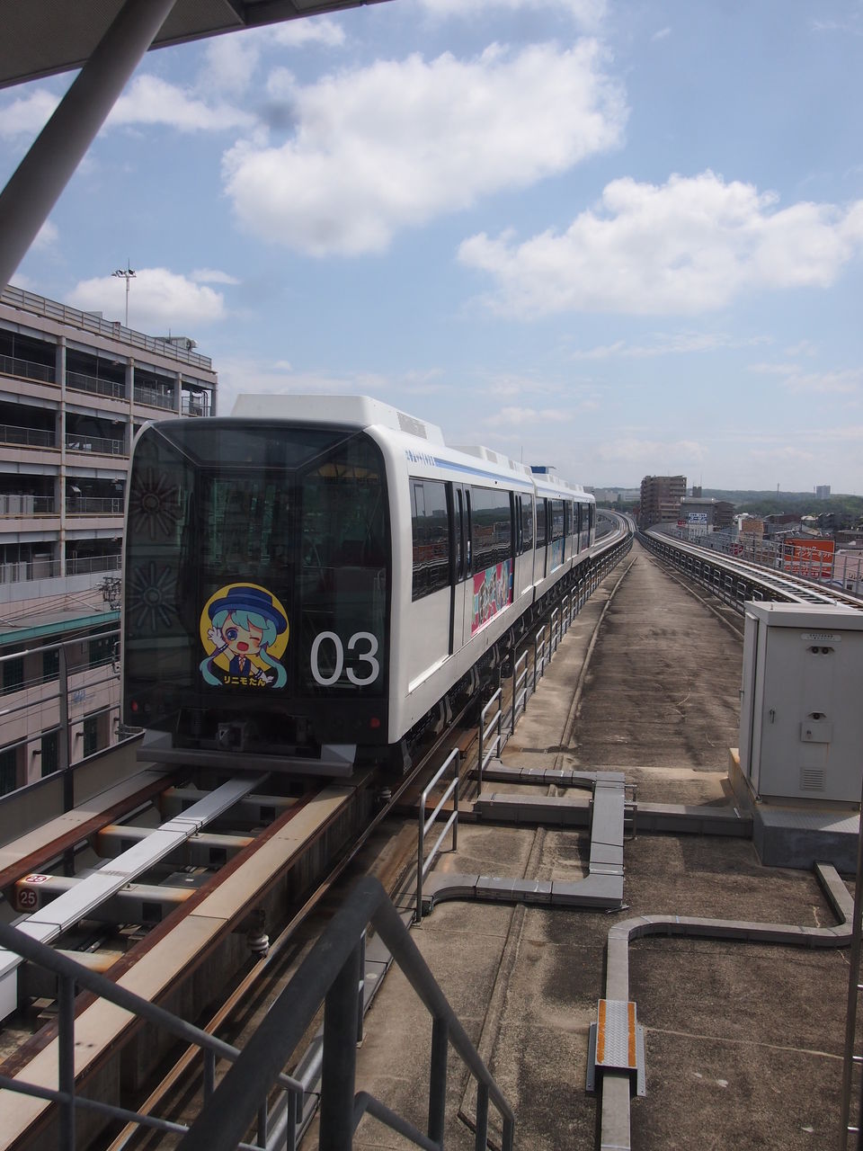 杁ケ池公園駅を去っていくリニモたんラッピングリニモ。なんとか側面のリニモたんを写真に収めました。
