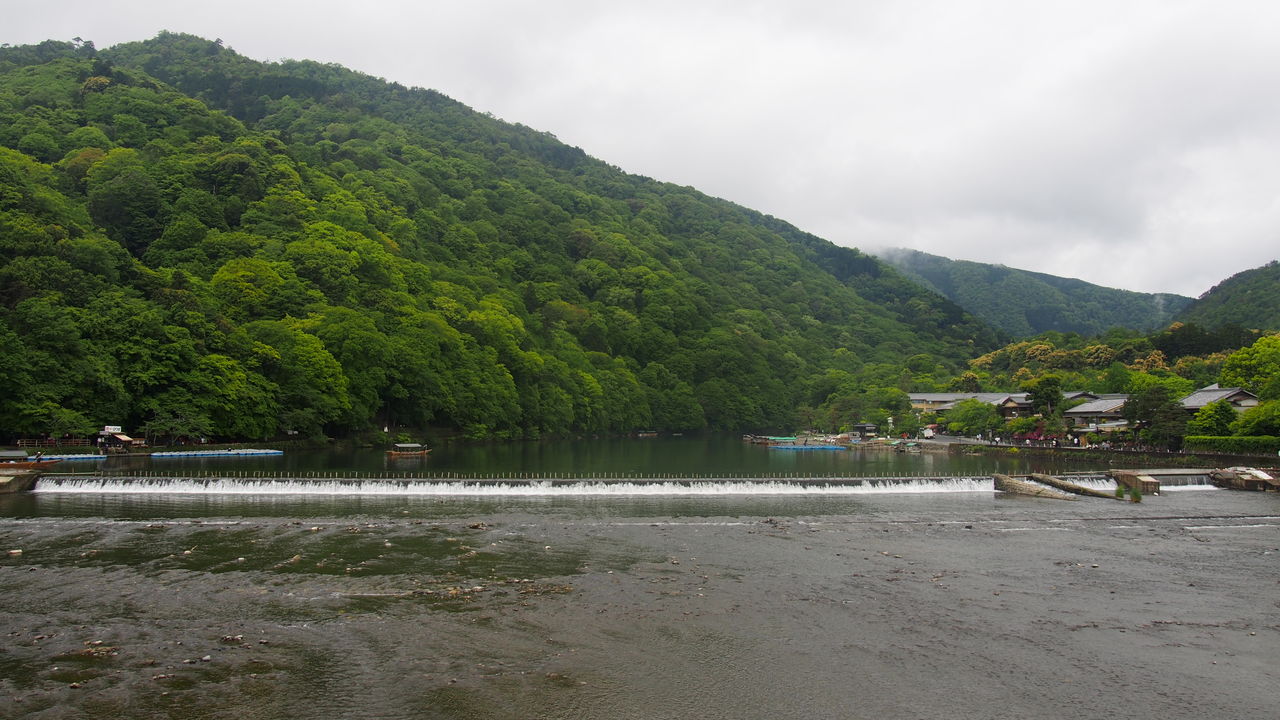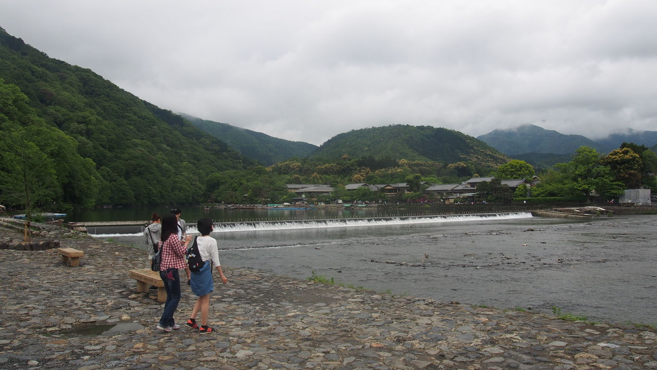 渡月橋の上より桂川上流方向。山の緑がまぶしいです。