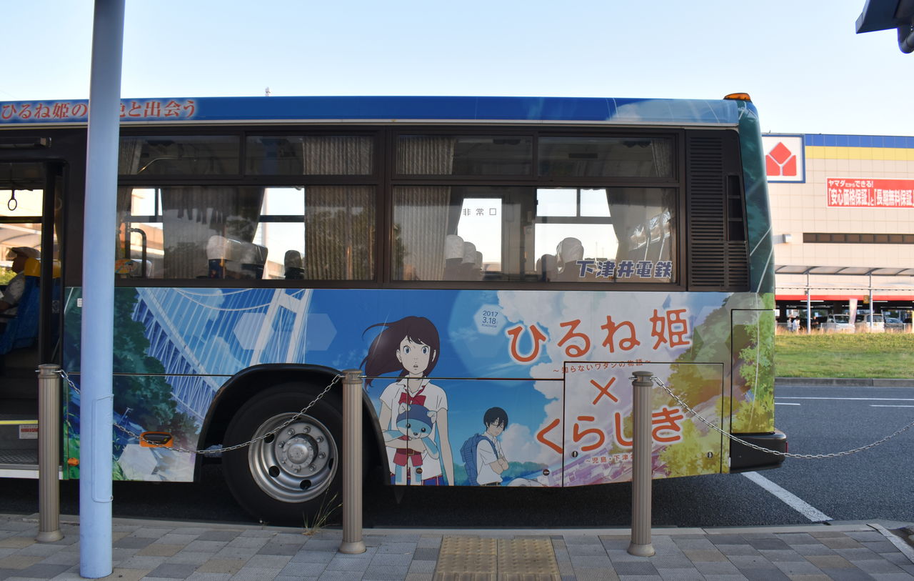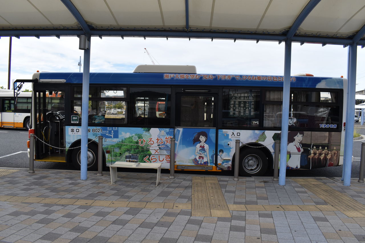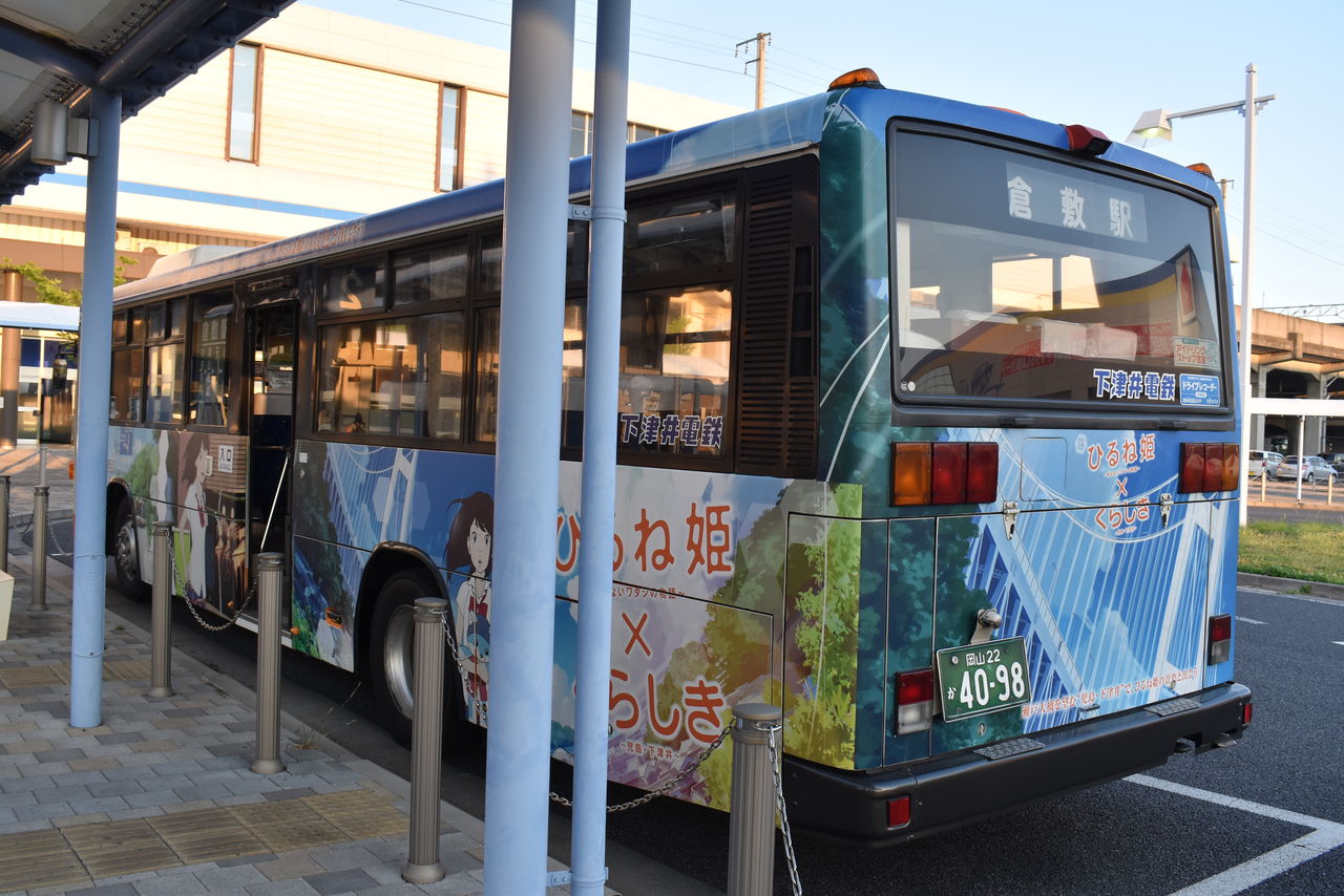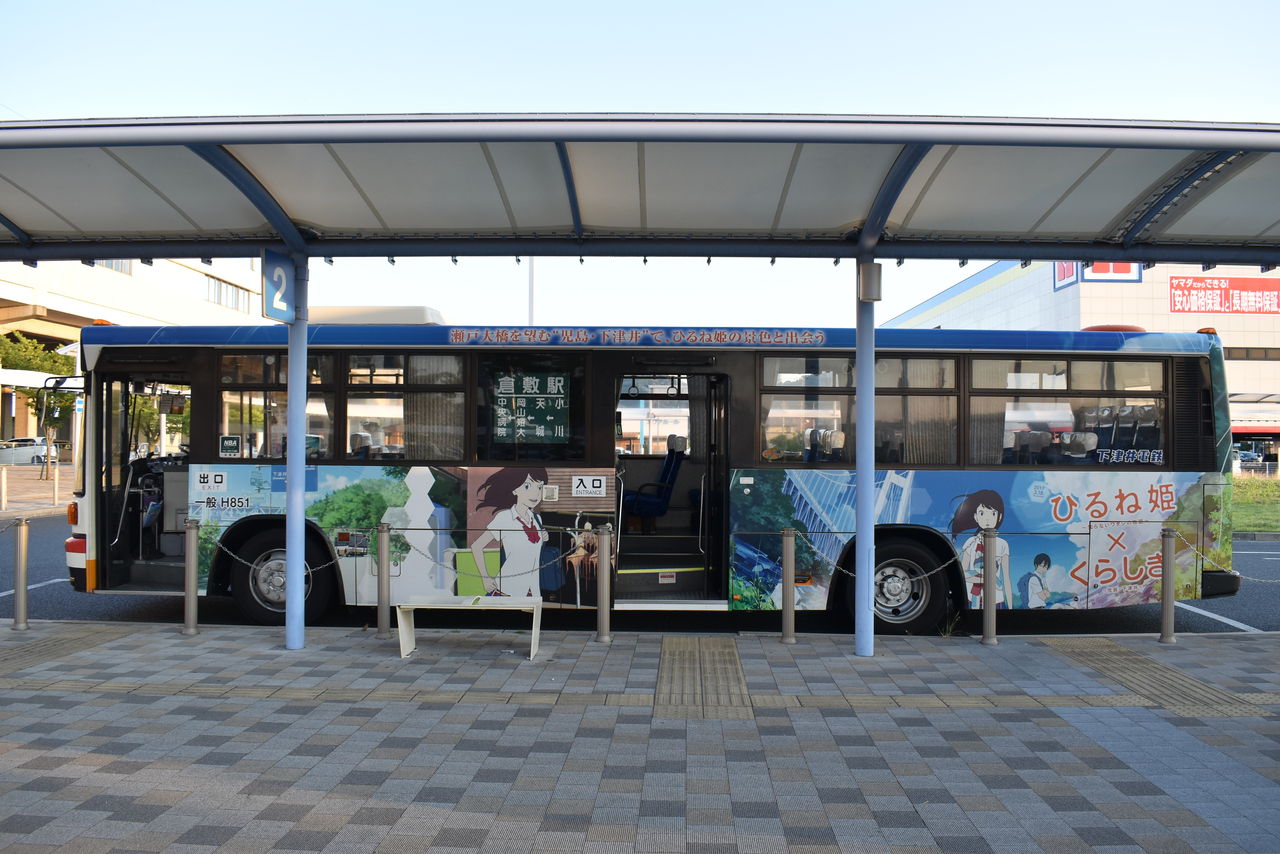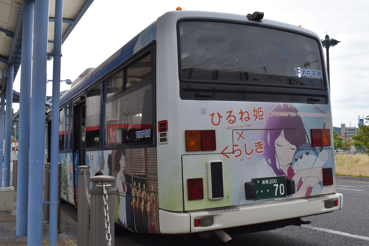 先週末行った「ひるね姫」を巡る倉敷の旅、「ひるね姫」ラッピング電車に続き、今回は「ひるね姫」ラッピングバスのレポートします。ラッピングバスは下津井電鉄大型、中型1台ずつの2台走ってるようです。