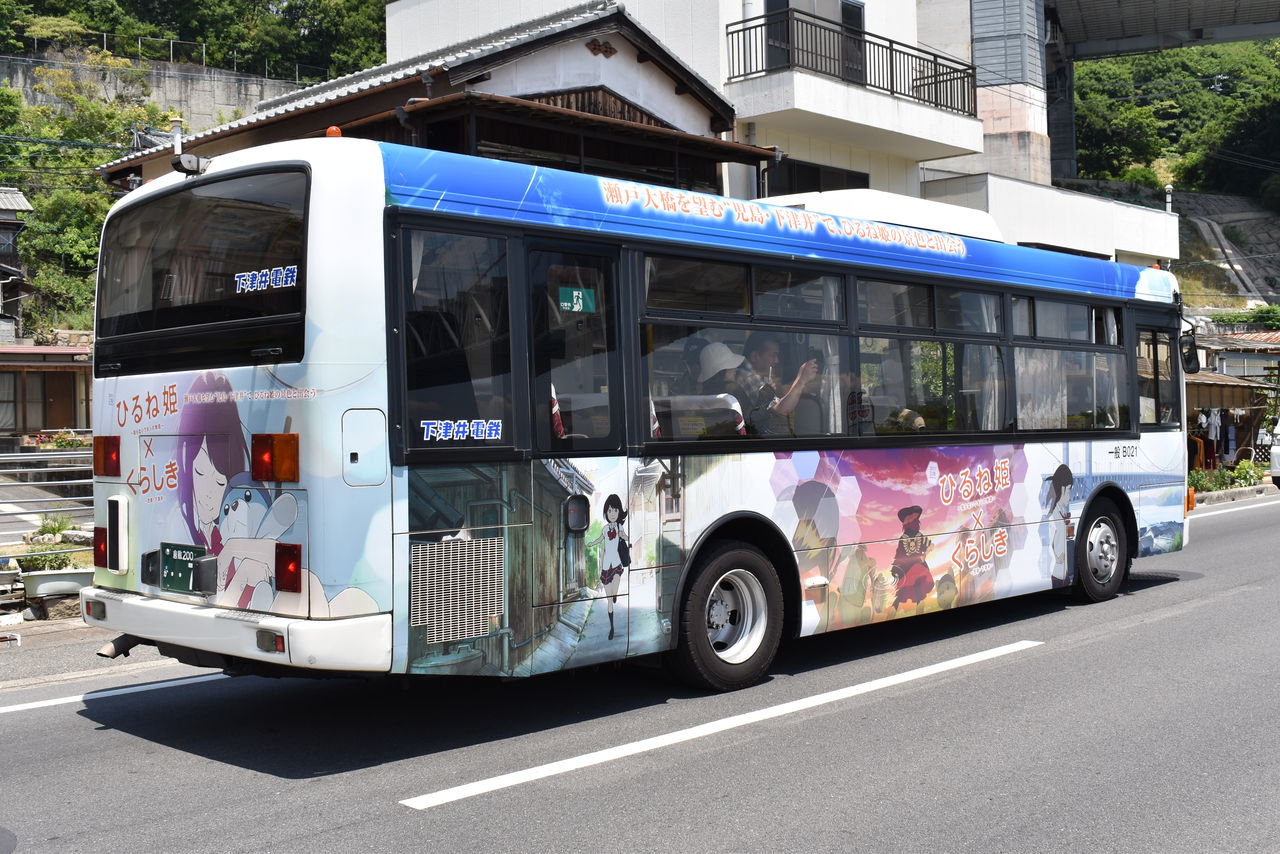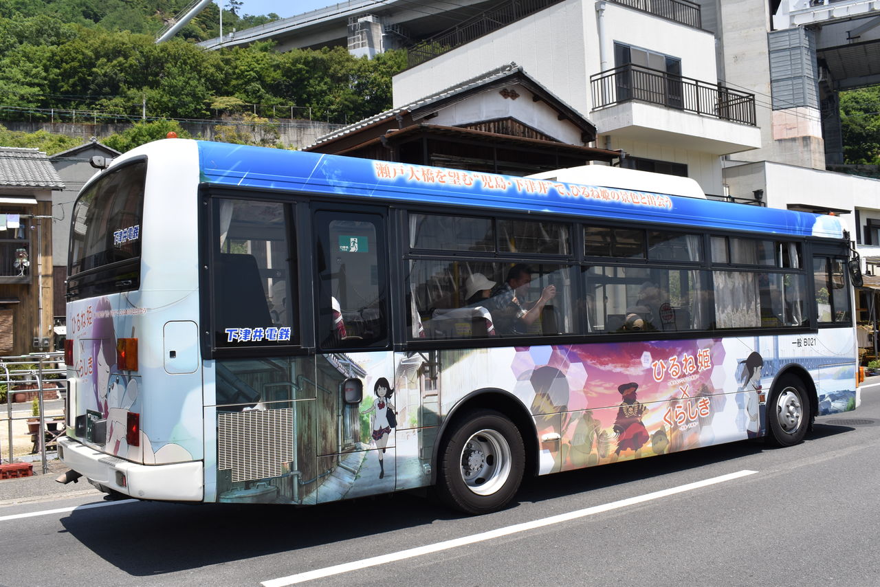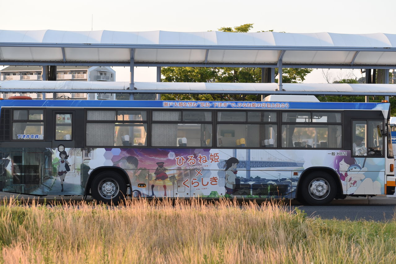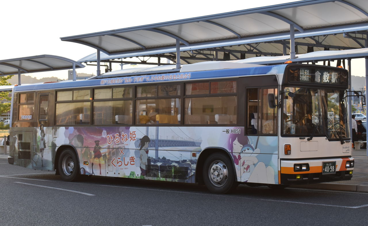 先週末行った「ひるね姫」を巡る倉敷の旅、「ひるね姫」ラッピング電車に続き、今回は「ひるね姫」ラッピングバスのレポートします。ラッピングバスは下津井電鉄大型、中型1台ずつの2台走ってるようです。