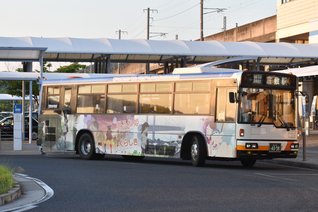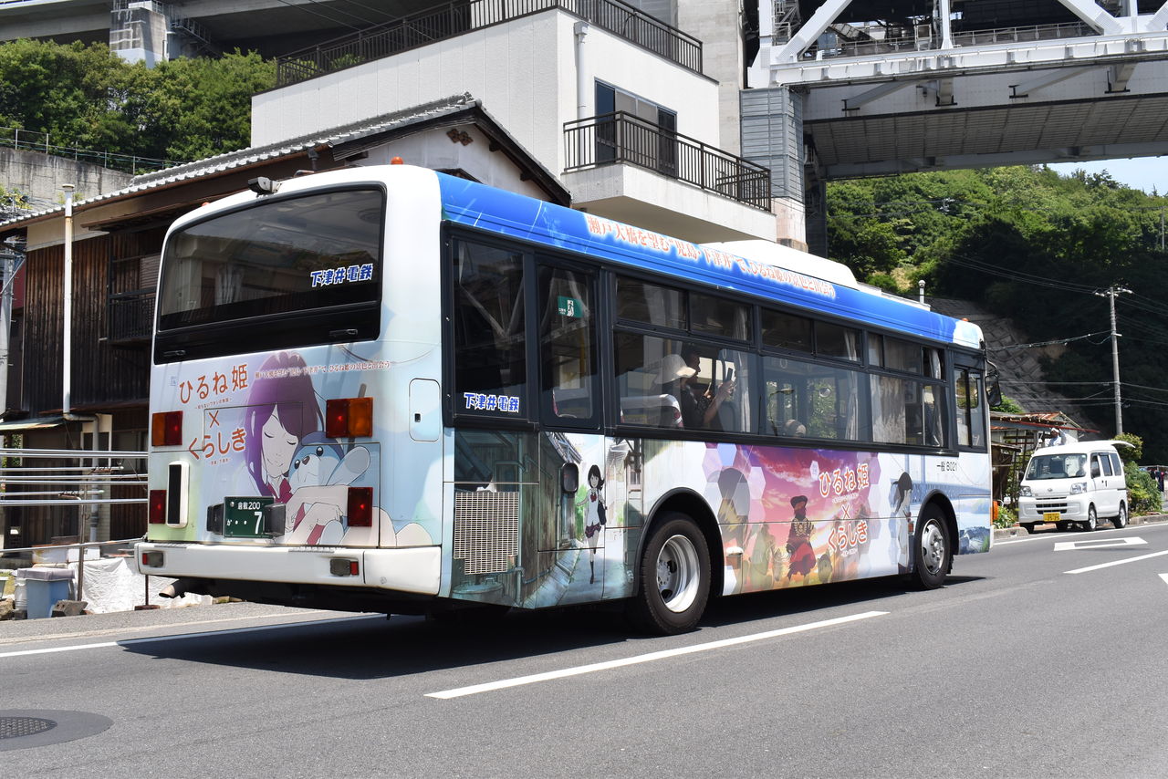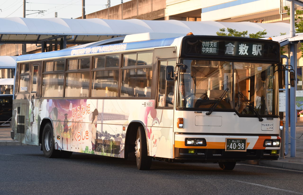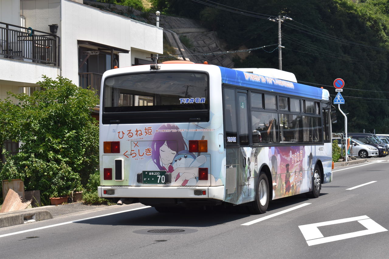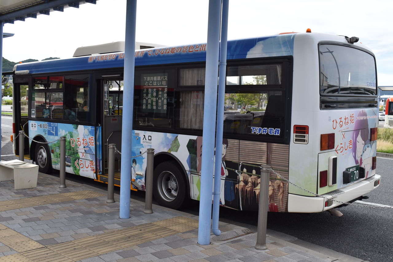 先週末行った「ひるね姫」を巡る倉敷の旅、「ひるね姫」ラッピング電車に続き、今回は「ひるね姫」ラッピングバスのレポートします。ラッピングバスは下津井電鉄大型、中型1台ずつの2台走ってるようです。