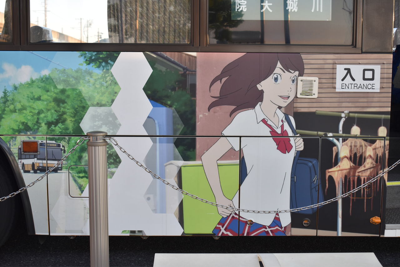駅前のバス停に停まってるひるね姫ラッピングの大型バス。