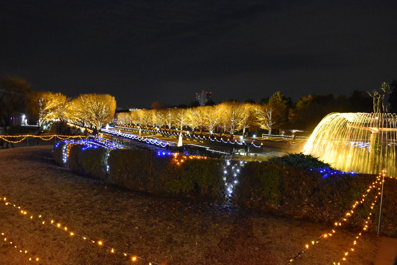 昭和記念公園のイルミネーションへ行ったのは12月2日の夜でした。夜の6時過ぎに立川に着いて、ホテルにチェックイン、すぐに出かけました。先にサンサンロードのイルミネーションなどを見た後、昭和記念公園へ向かいました。