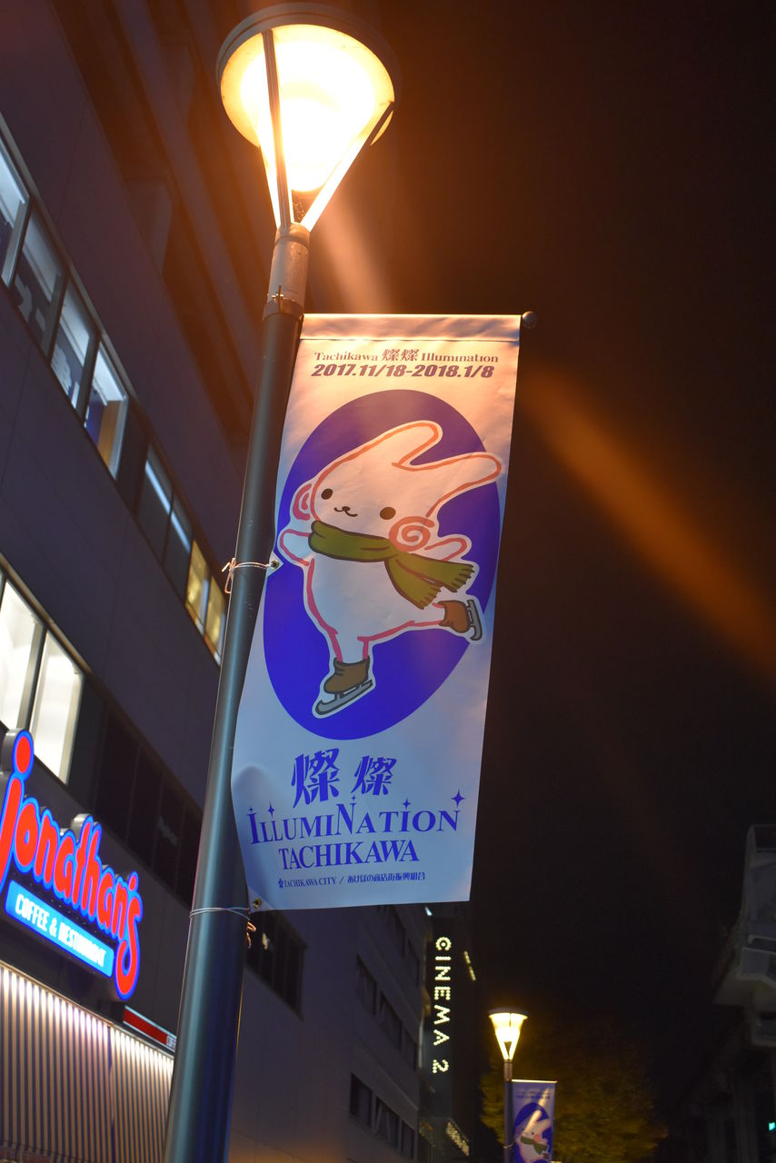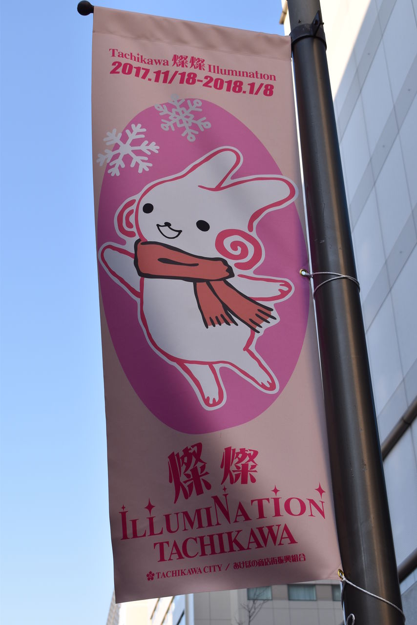 約4年前、はじめて立川に来た時に見たのがこのサンサンロードのイルミネーション告知フラッグでした。去年も女の子の絵だったみたいなので、今回も期待したんですが、まさかの”くるりん”。まあ”くるりん”も好きなので良いんですけどね。