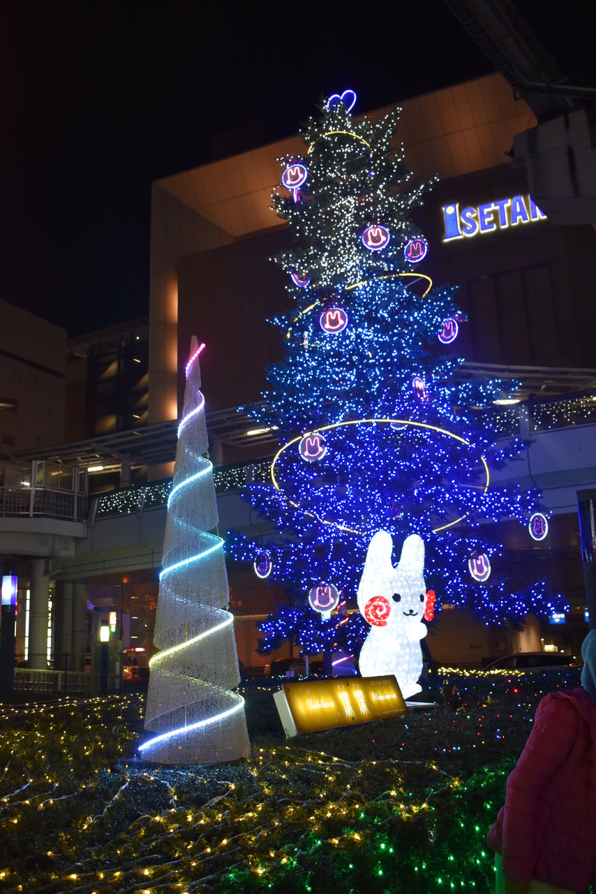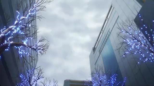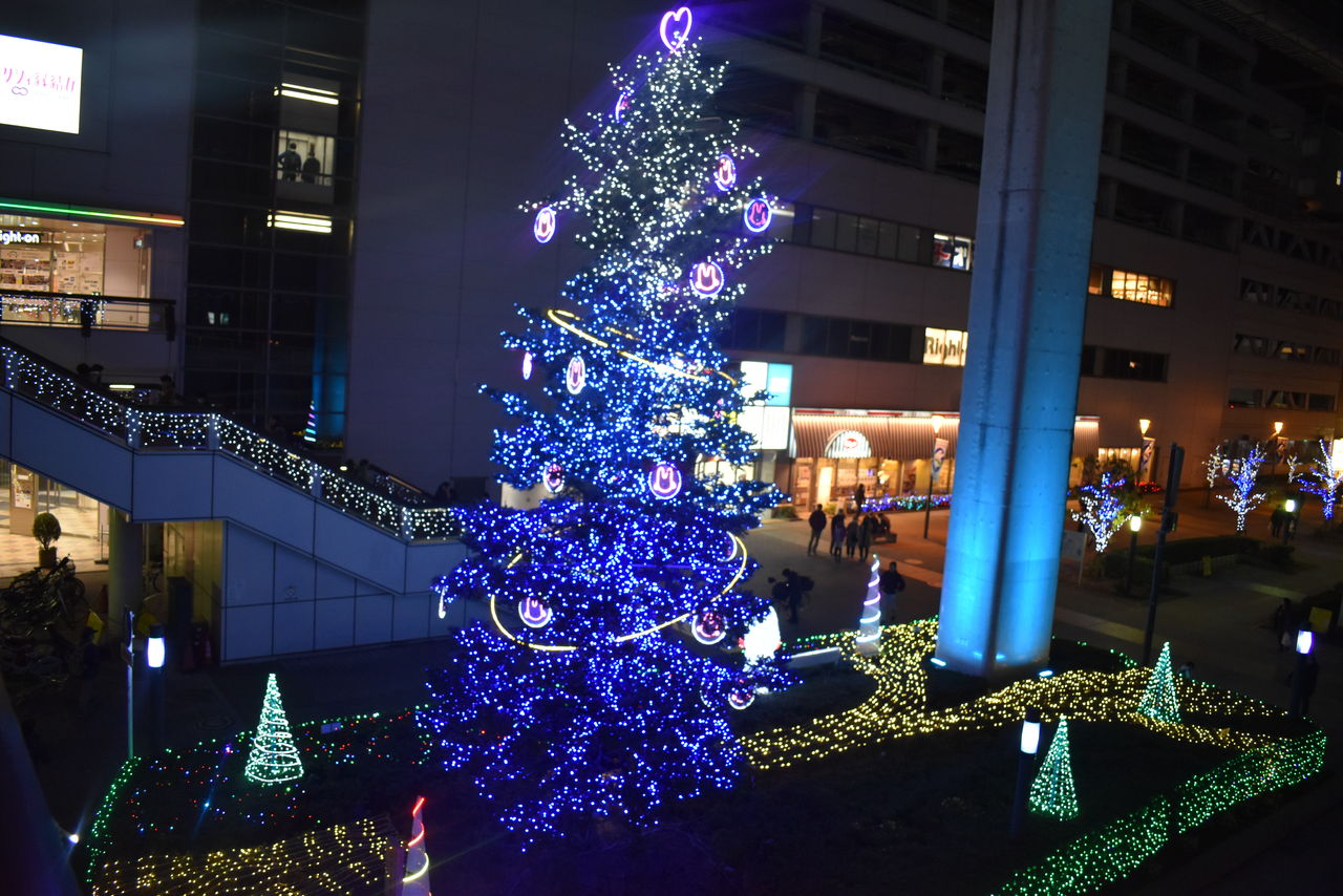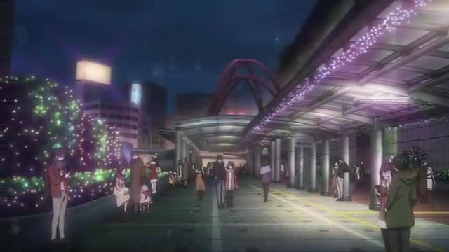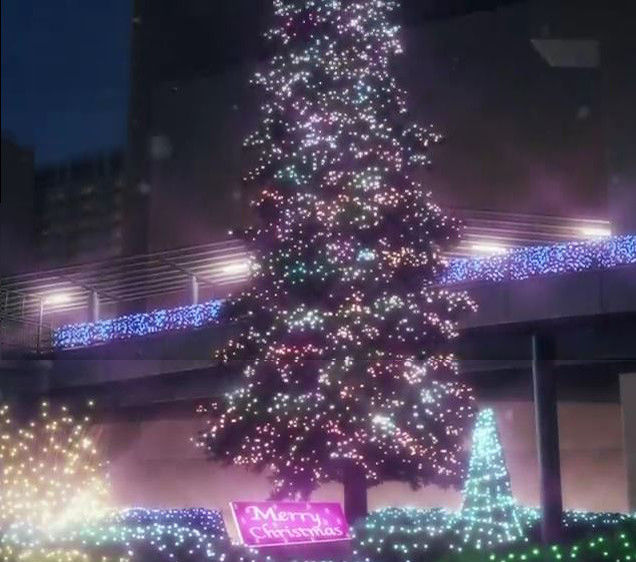 同じく12話(最終話)より。駅前のイルミネーションのカット。サンサンロードのクリスマスツリーのイルミネーションですね。