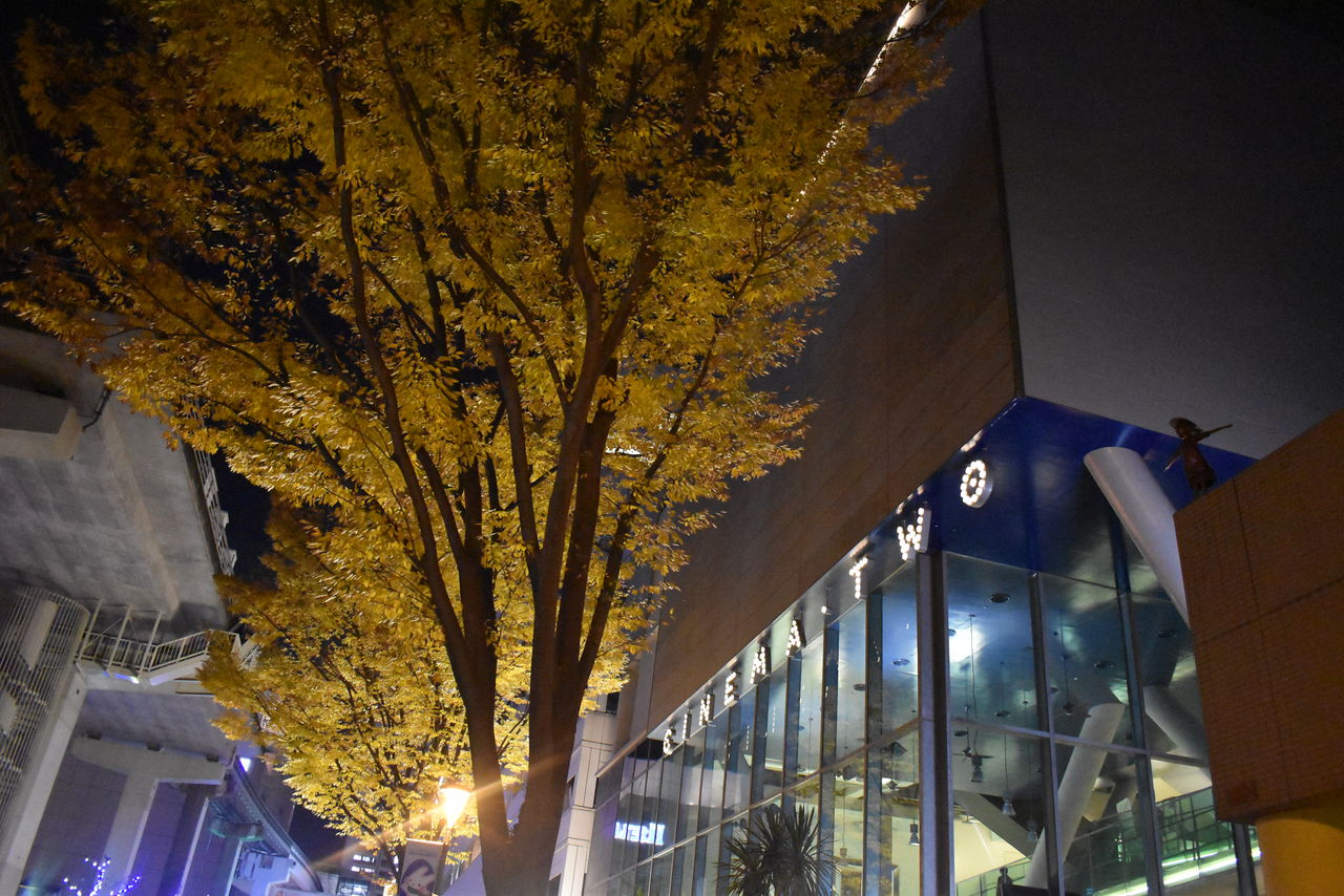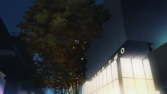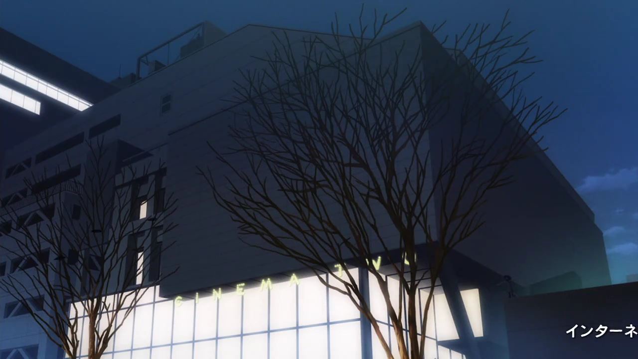 10話のシネマシティ・シネマツーのカット。建物の前の木が、まだ枯れ木になってなかったのが惜しかったですけど。以前の記事でも紹介しましたが、今回はシーンに合わせて夜の絵を撮ってみました。