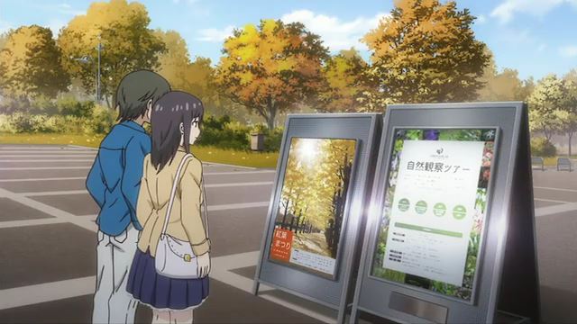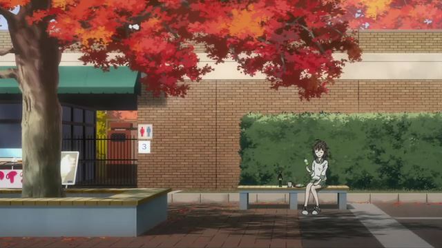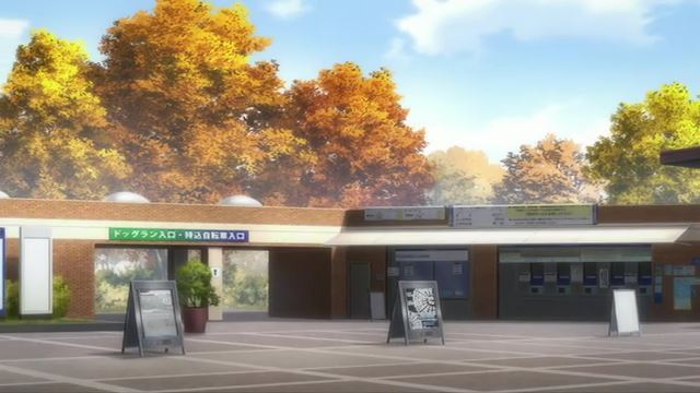 第8話Bパート「秋に呼ばれて…」のカット。立川口のお団子ベンチの場所ですが、屋台ができてしまってました…。