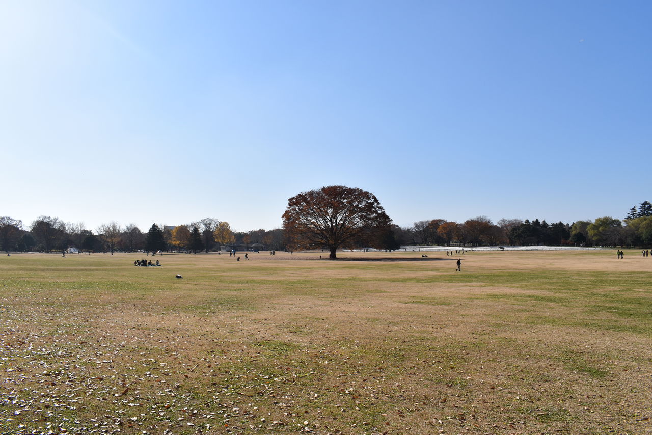 公園のほぼ中央に位置する「みんなの原っぱ」ですね。「この木なんの木気になる木♪」的な大木が印象的です。