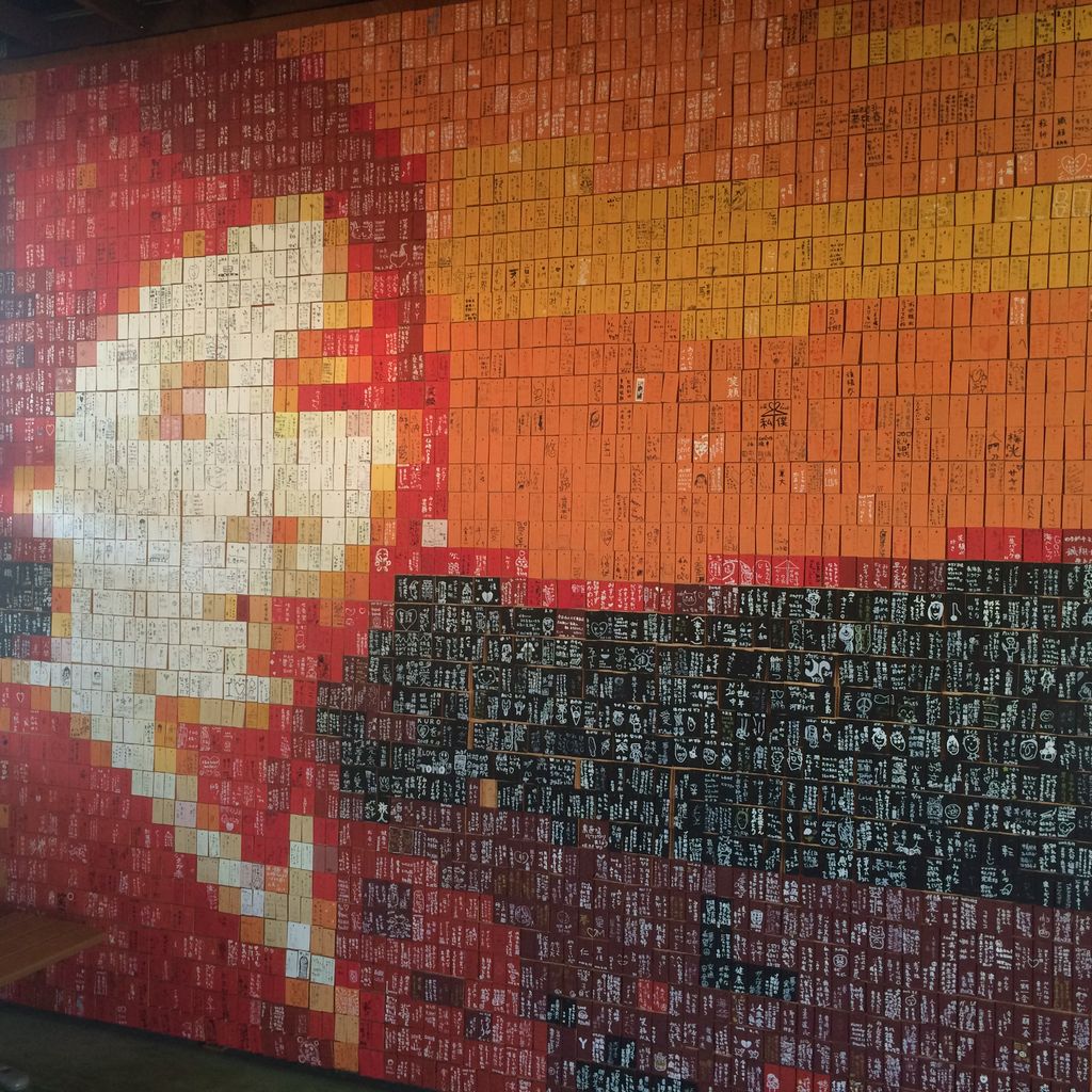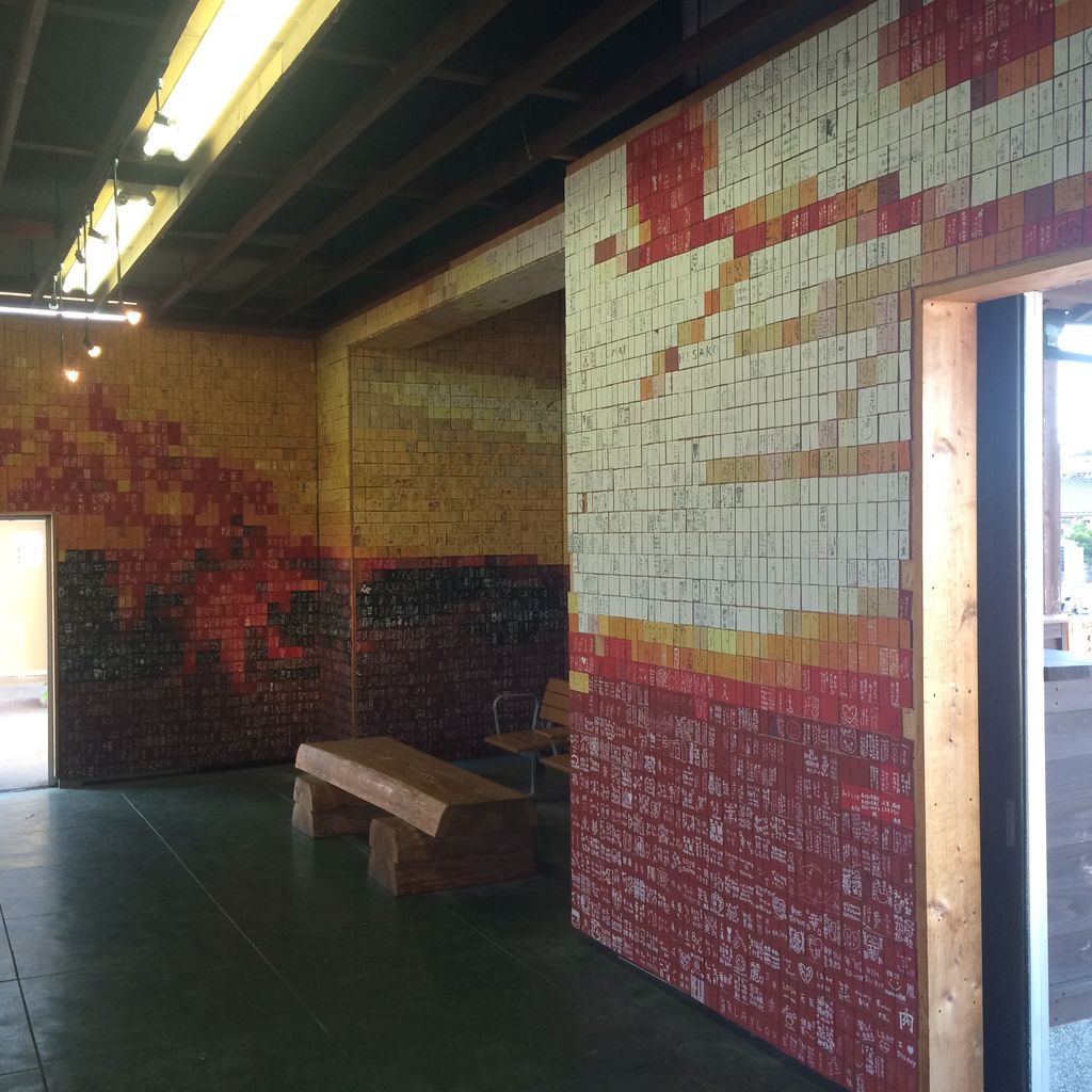 駅舎内の壁にはかまぼこ板のモザイク画が設置されています。それぞれのかまぼこ板にはメッセージが書いてありました。