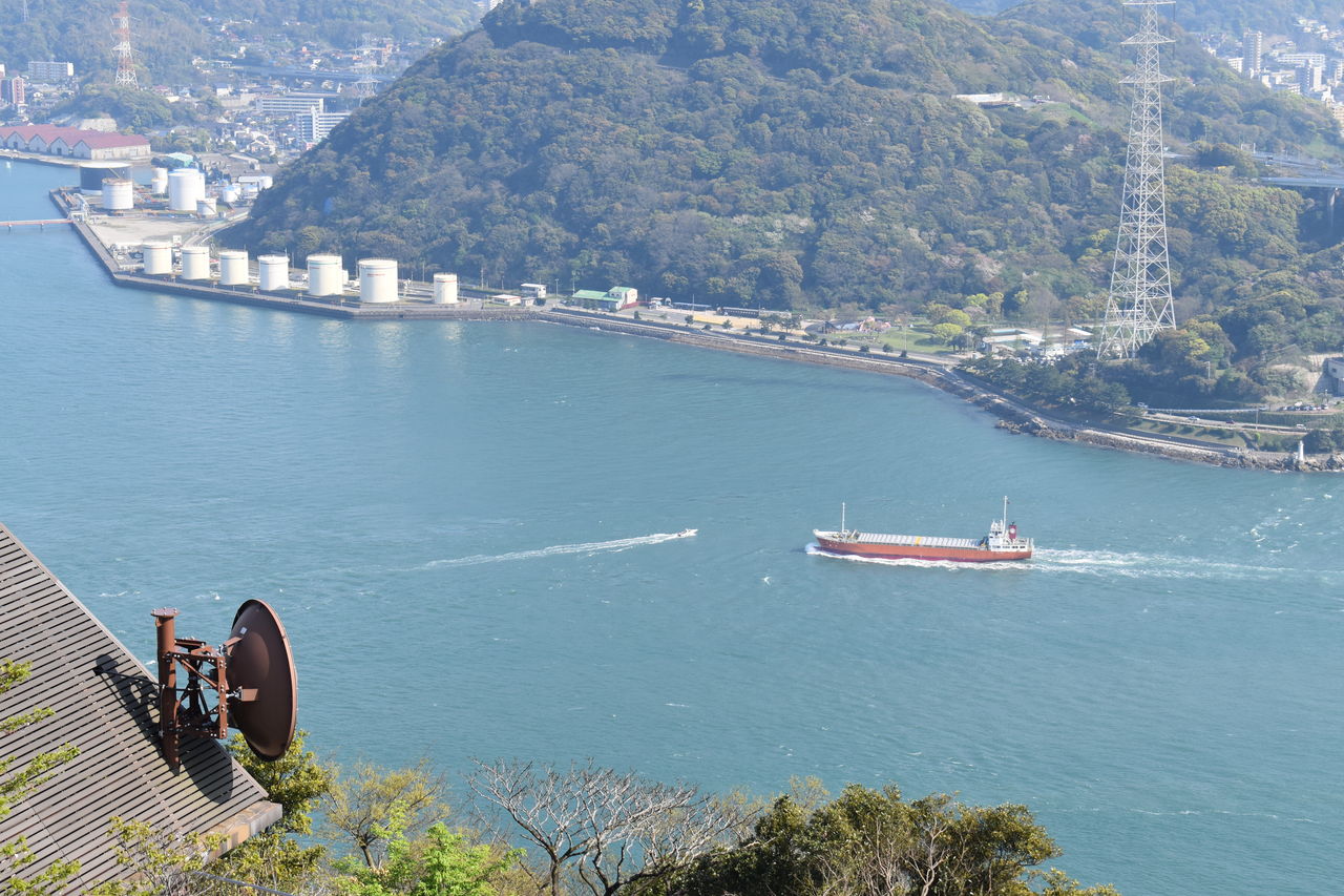 関門海峡、めかり公園(門司城跡)方向。右側に写ってる展望室はリニューアル工事中につき平成31年まで閉鎖らしいです。