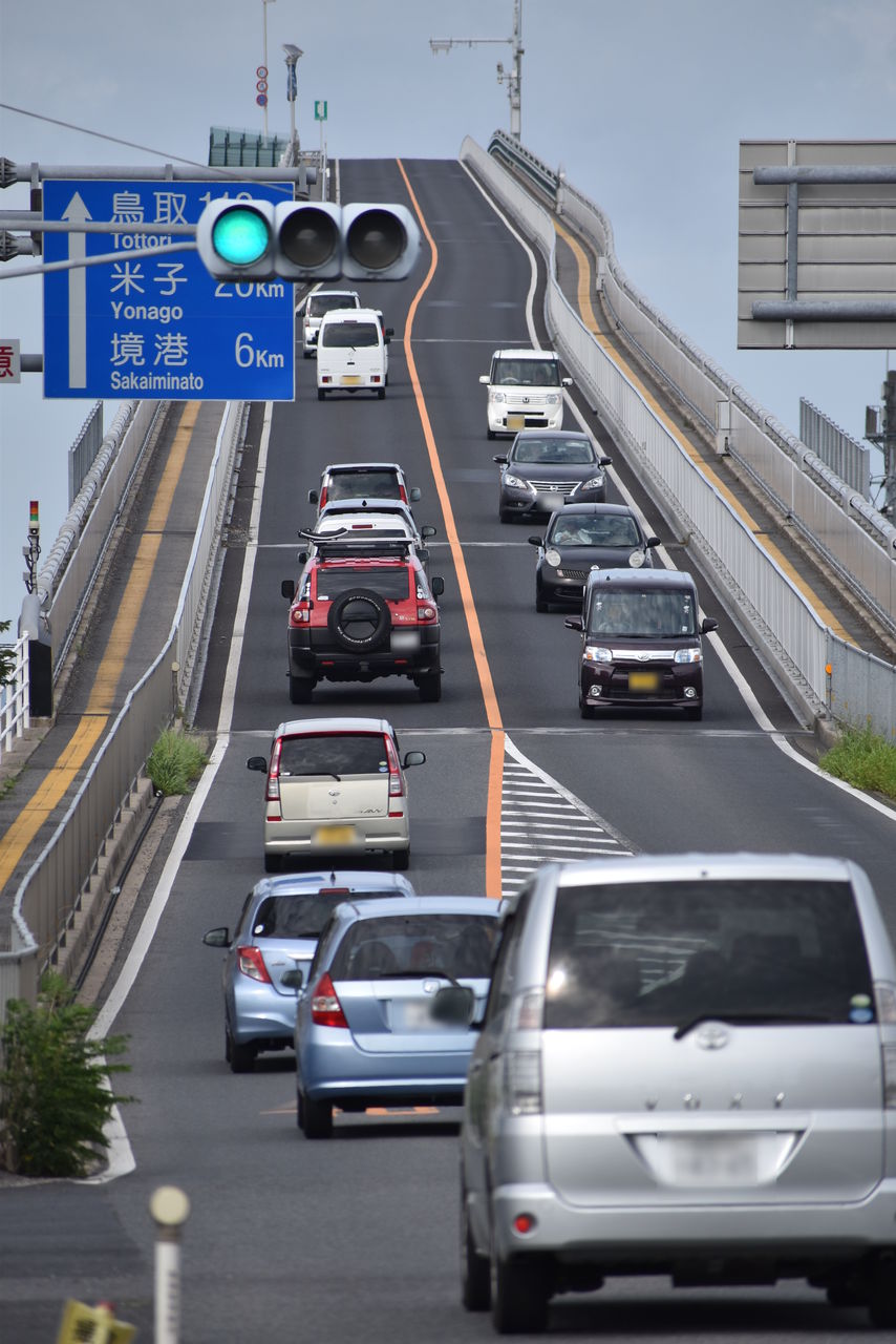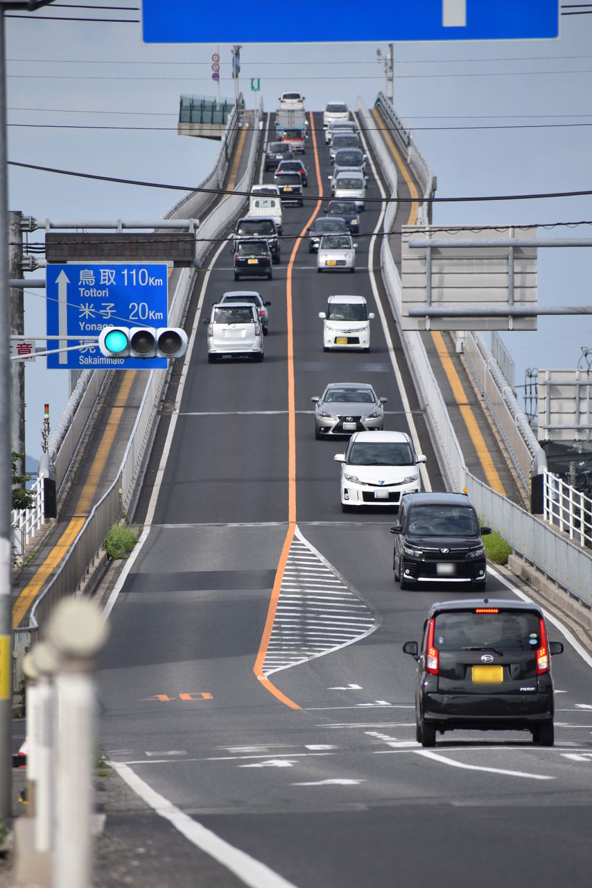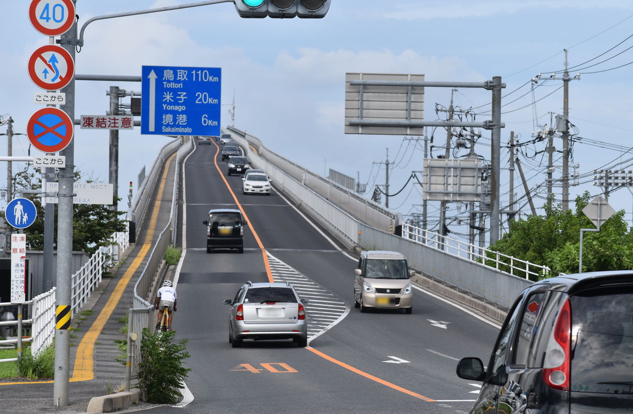 境港と大根島を結ぶ江島大橋。鳥取と島根の県境を渡る橋でもあります。有名な「ベタ踏み坂」は大根島のほうからのこの景色。