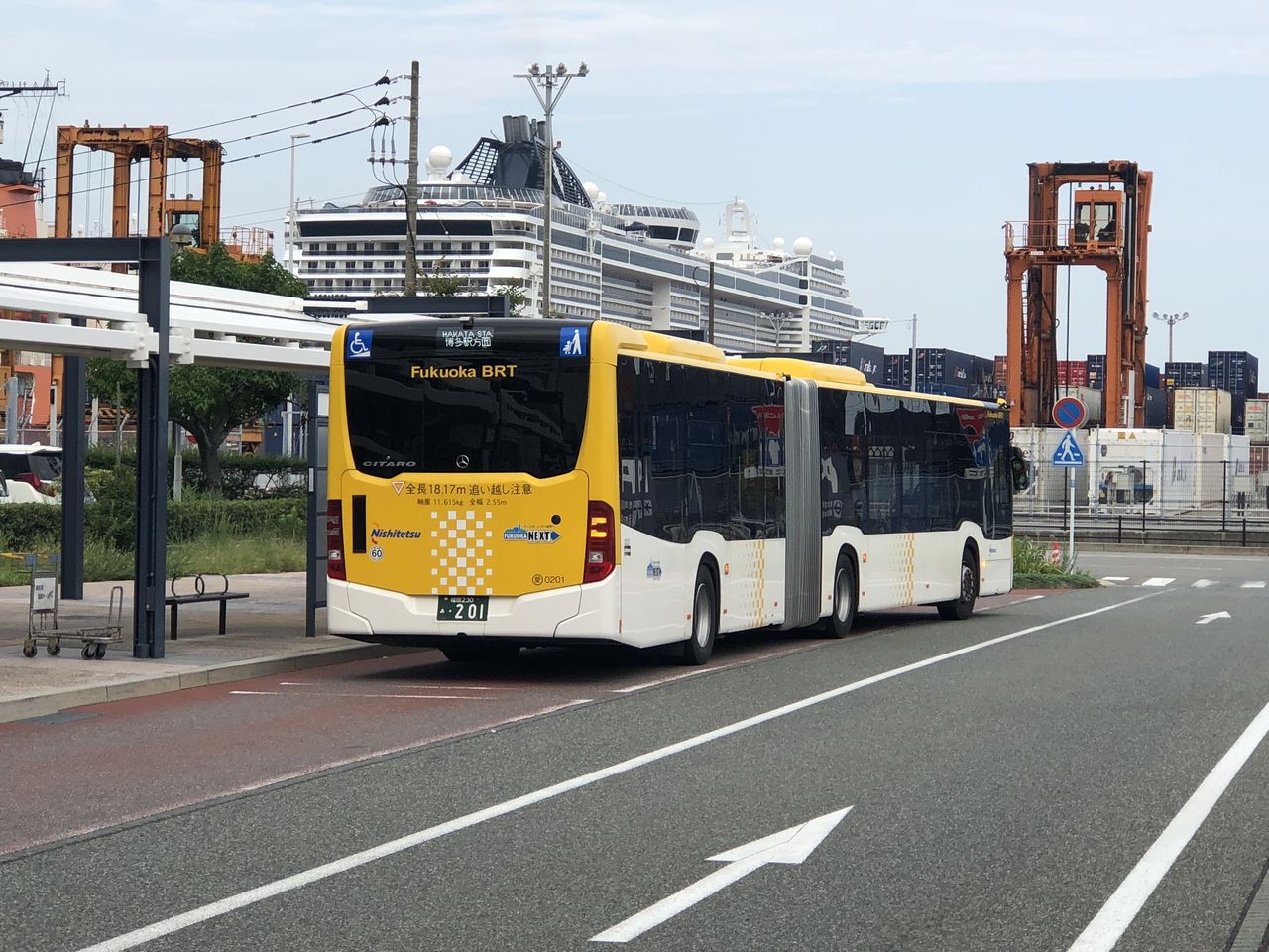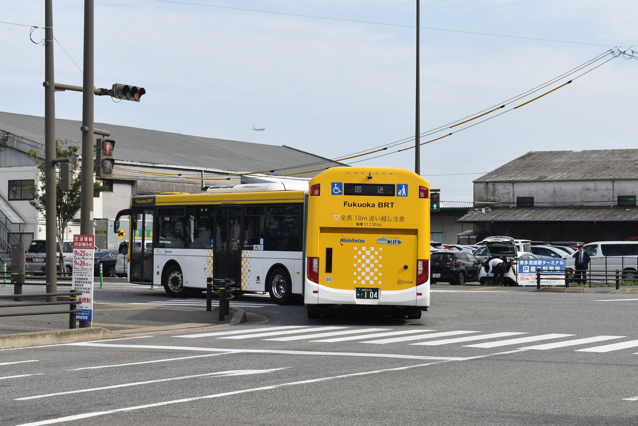 西鉄の連節バス「福岡BRT」。中央埠頭ではよく見かけます。