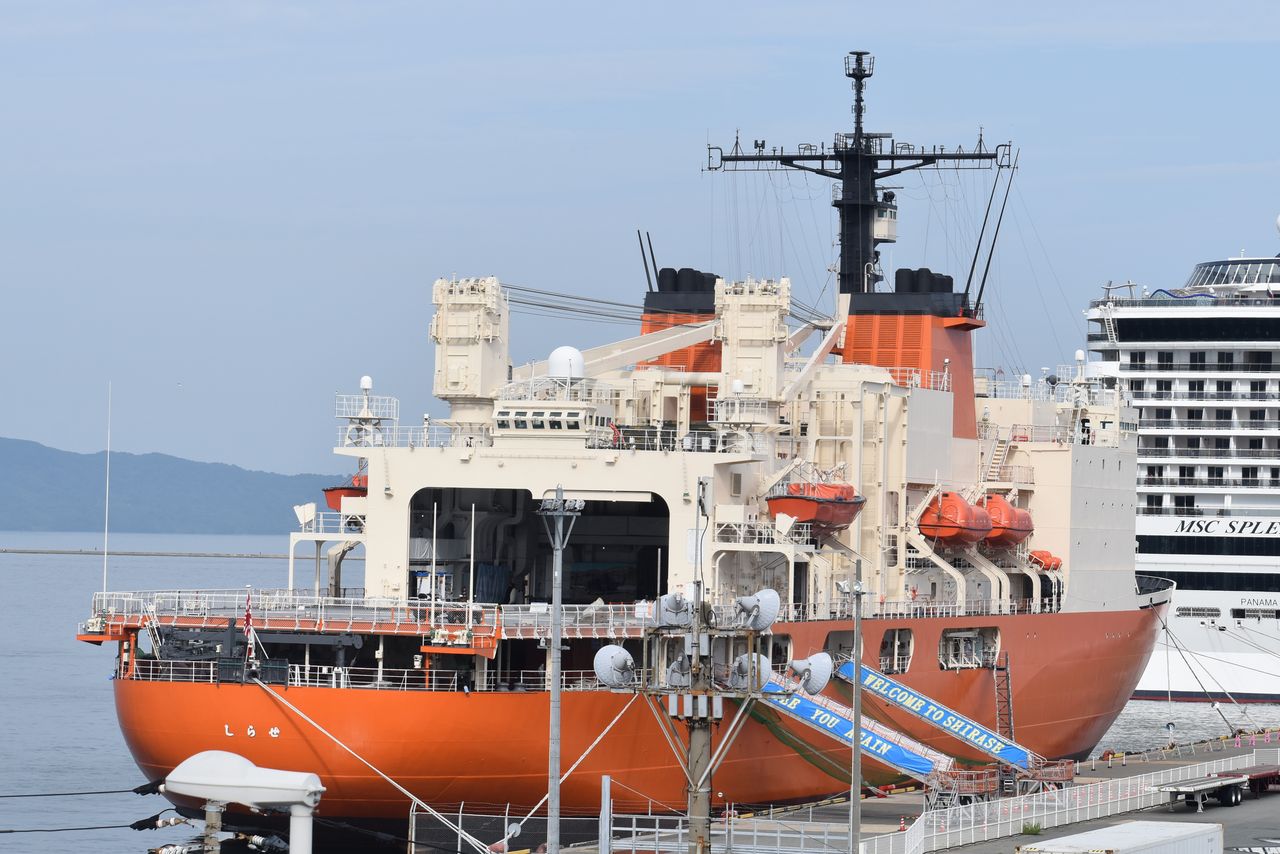 「しらせ」の停泊している中央埠頭クルーズセンターまで行ってみましたが、岸壁は一般人シャットダウン…。ここからしか撮れませんでした。
