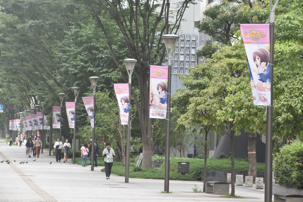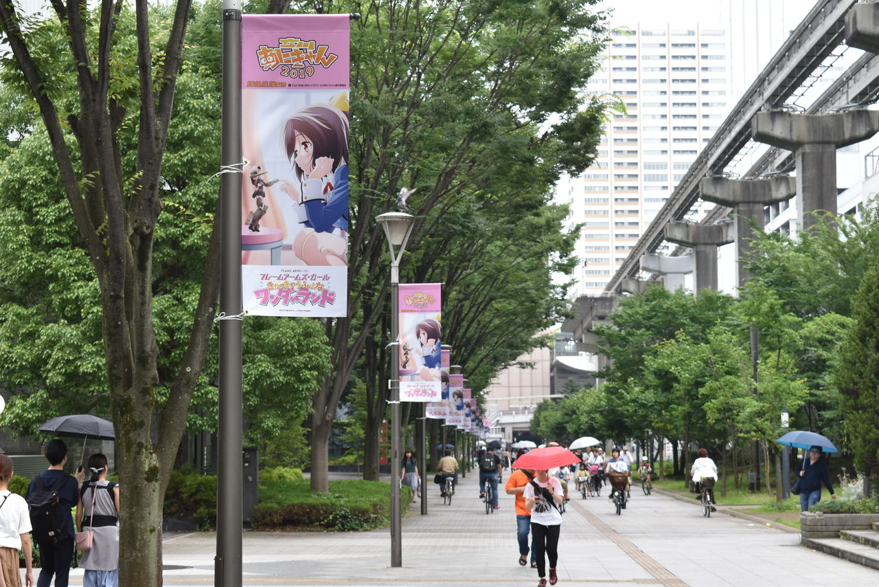 サンサンロードに立ち並ぶ劇場版「フレームアームズ・ガール」フラッグ、壮観です!