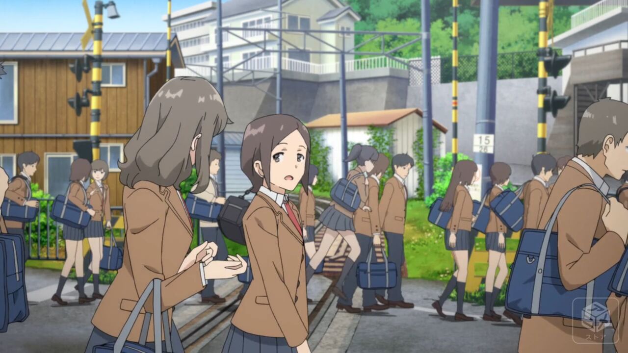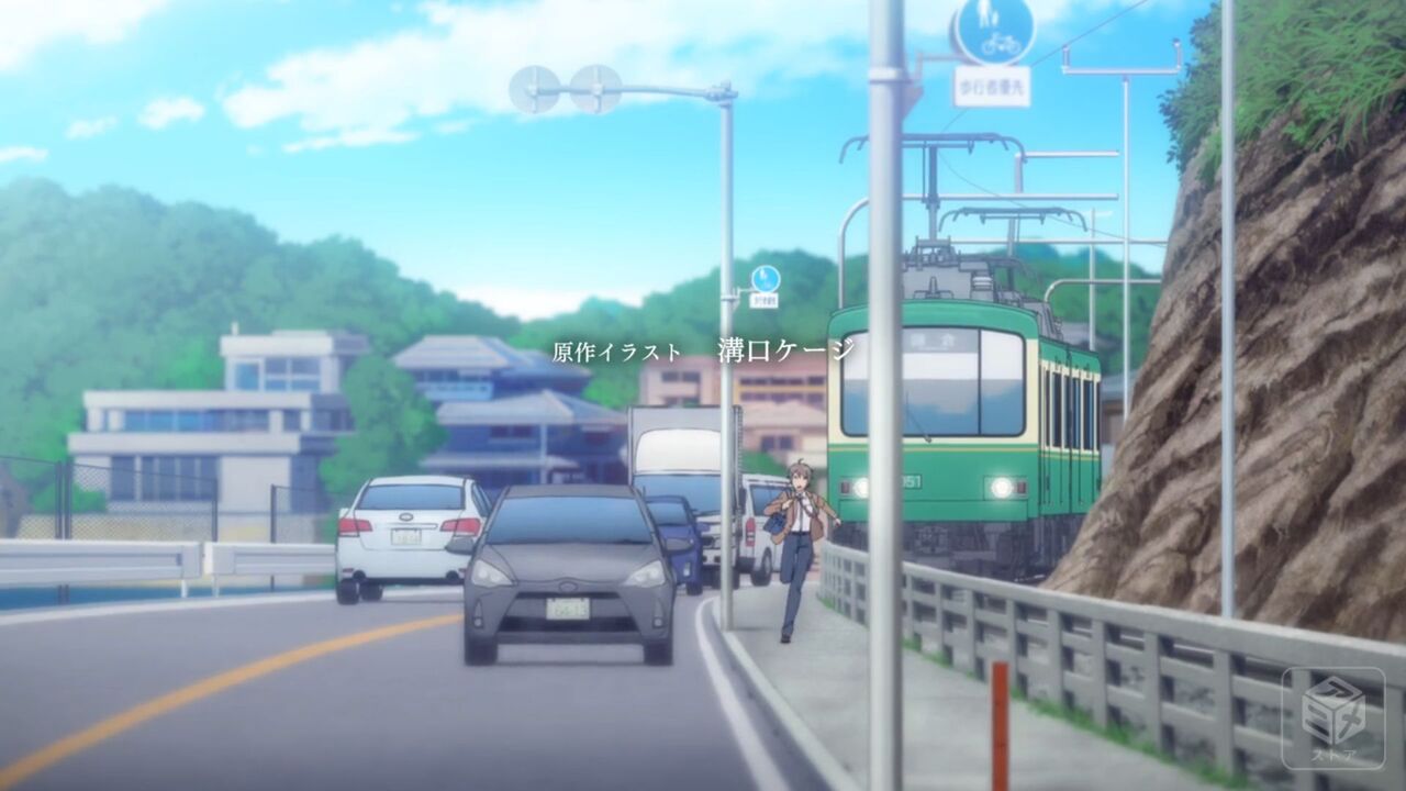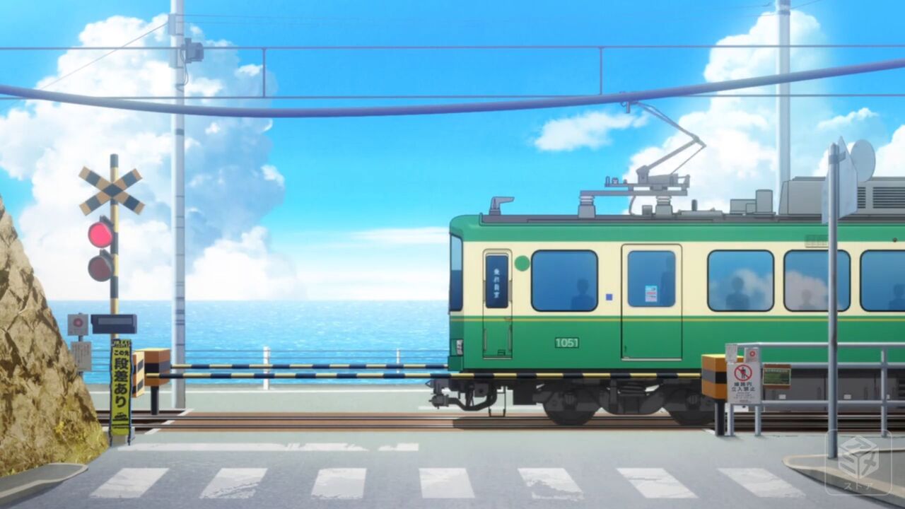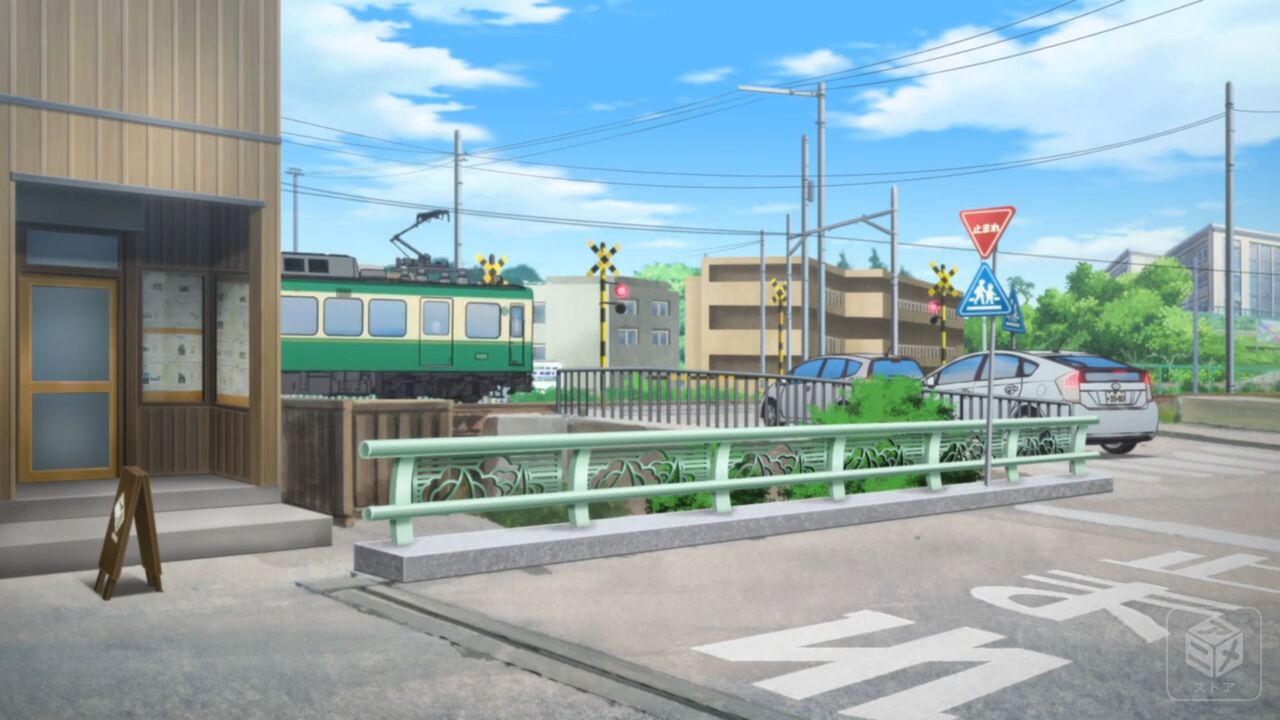 第1話より。七里ヶ浜1号踏切。七里ガ浜高校校門前の踏切です。