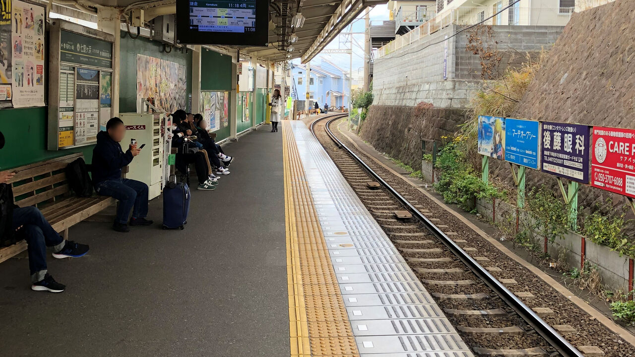 江ノ電江ノ島線の「七里ヶ浜駅」です。咲太たちの通う峰ヶ原高校(モデル:七里ガ浜高校)最寄りの駅です。1面1線の単式ホームの駅ですね。利用客が多いので撮影には気を使いますね。