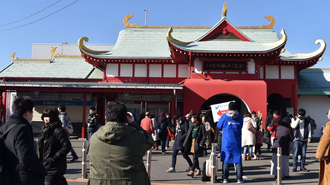 江ノ電の「江ノ島駅」。北側すぐに湘南モノレールの「湘南江の島駅」南へ少し離れて小田急江ノ島線の「片瀬江ノ島駅」があります。