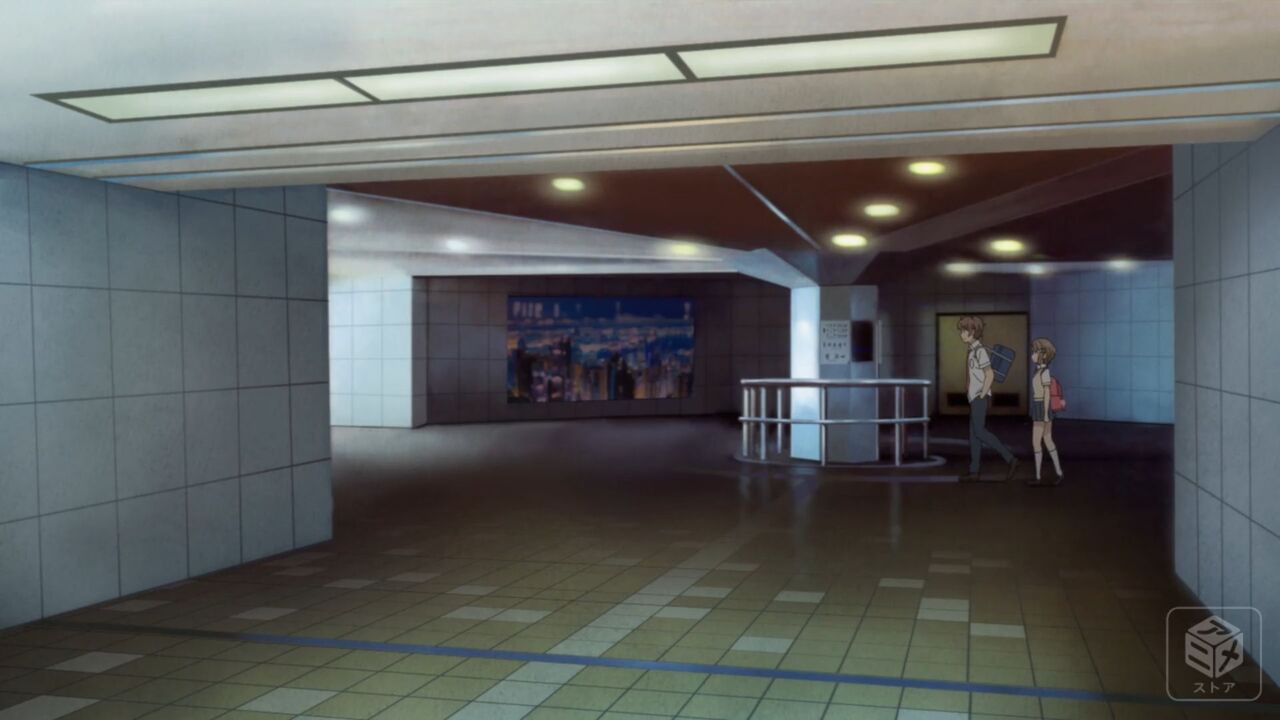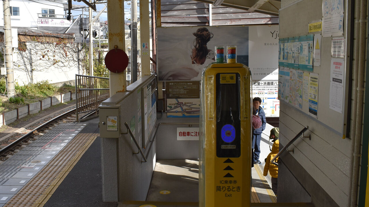 第1話より。七里ヶ浜駅の改札口です。ICカード用の簡易改札機が設置されています。