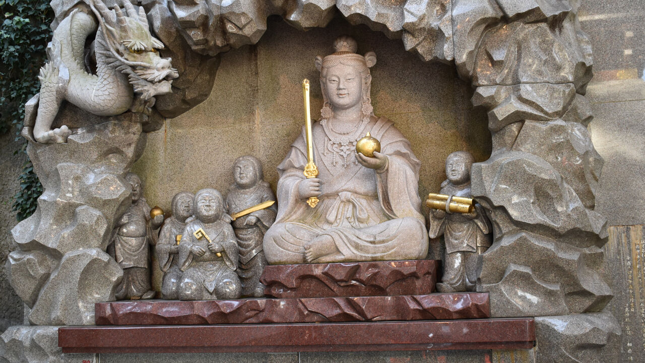 第6話より、弁財天・童子像。江島神社の楼門のくぐってすぐです。