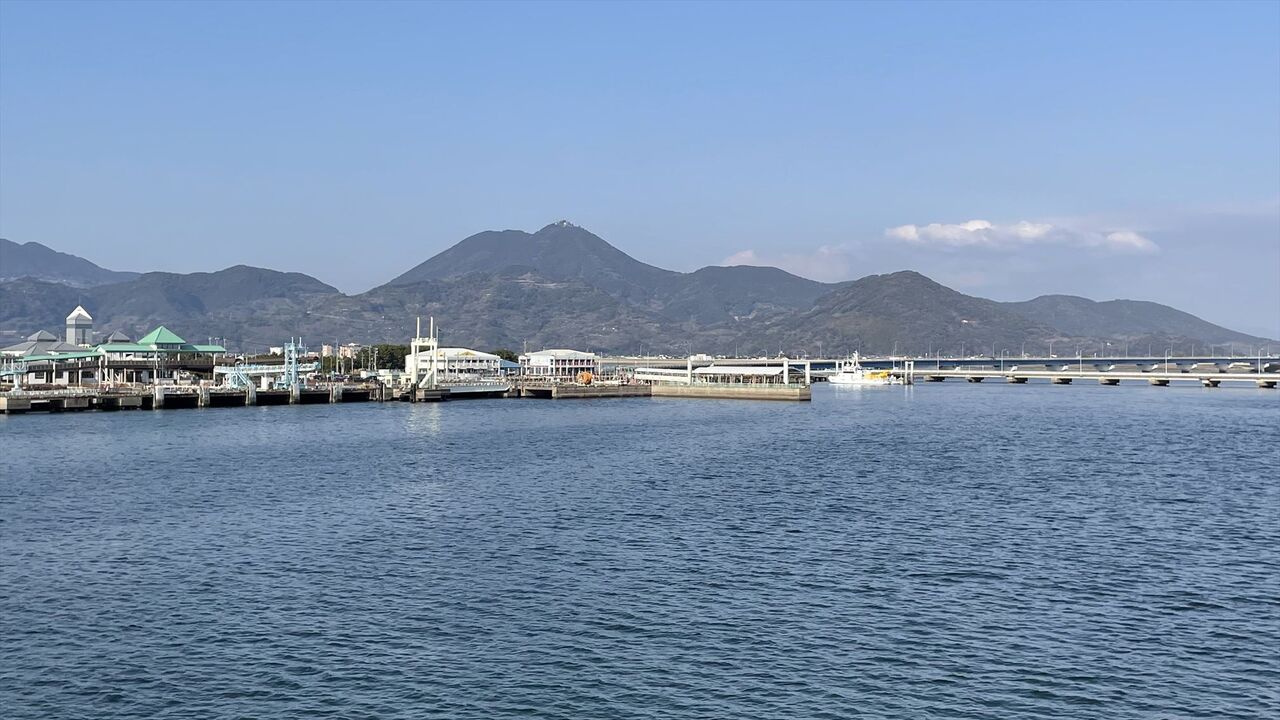 フェリーターミナル前から雲仙を望む。